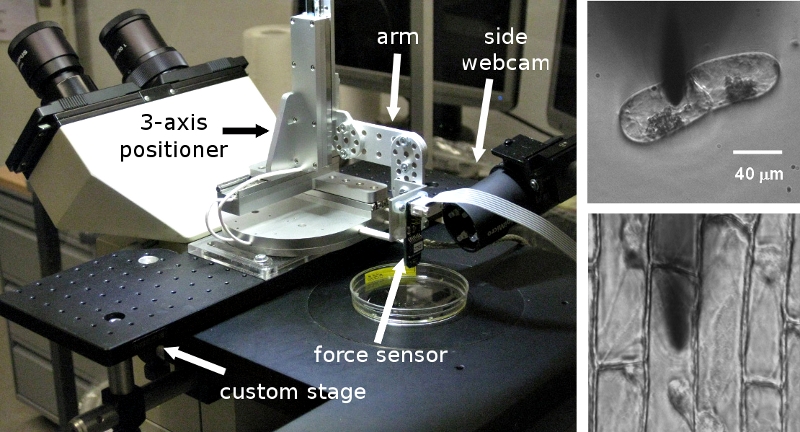 Figure 2 Published May 9, 2013 at 800 × 432 in Cellular Force Microscopy Fig2. Left: CFM on an inverted light microscope. Right: microscopy pictures showing the samples (here, BY2 cells and onion epidermis) and probe tip during the measurement.